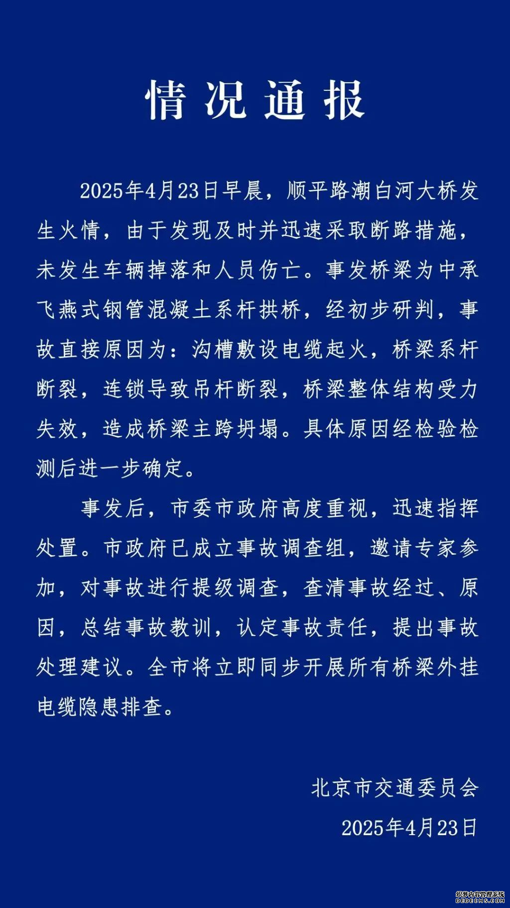 同日,北京市交通委通報(bào)順平路潮白河大橋事故:事發(fā)橋梁為中承飛燕式鋼管混凝土系桿拱橋,經(jīng)初步研判,事故直接原因?yàn)椋簻喜鄯笤O(shè)電纜起火,橋梁系桿斷裂,連鎖導(dǎo)致吊桿斷裂,橋梁整體結(jié)構(gòu)受力失效,造成橋梁主跨坍塌。具體原因經(jīng)檢驗(yàn)檢測(cè)后進(jìn)一步確定。